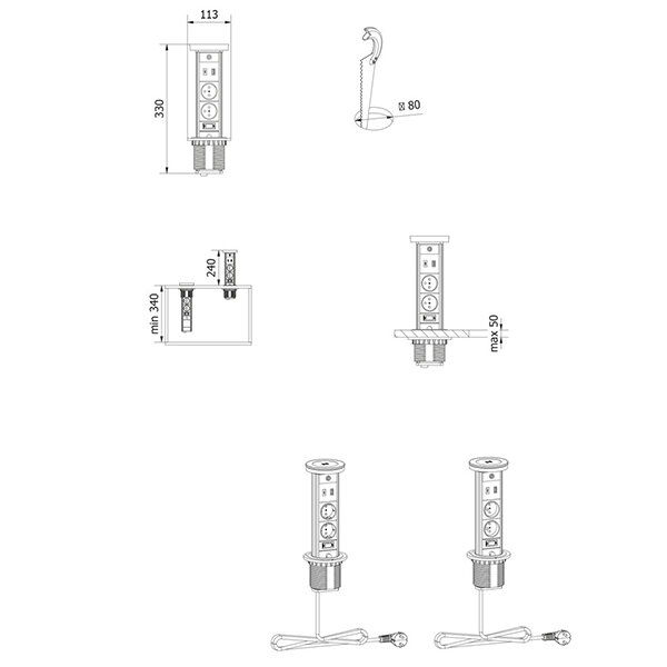 Het Camino uittrekbare stopcontact/stekkerdoos is een voorbeeld van egonomie en minimalisme. Het inbouwstopcontact neemt niet veel ruimte in beslag en is dus perfect voor smalle tafels en studenten bureau's. De nachtlicht functie zal vooral nachtbrakers aanspreken. De oplossing zal ook goed werken in de keuken bij het bereiden van uw maaltijd. Het pop-up stopcontact is handig in gebruik. Trek het gewoon omhoog totdat het onderste deel op zijn plaats klikt. Voorzien van draadloze oplader en 1 x USB-A en 1 x USB-C aansluiting.