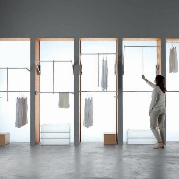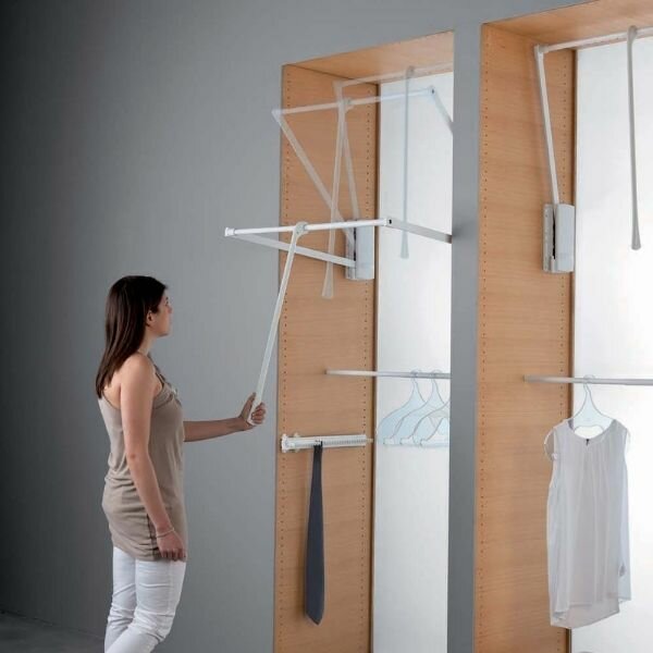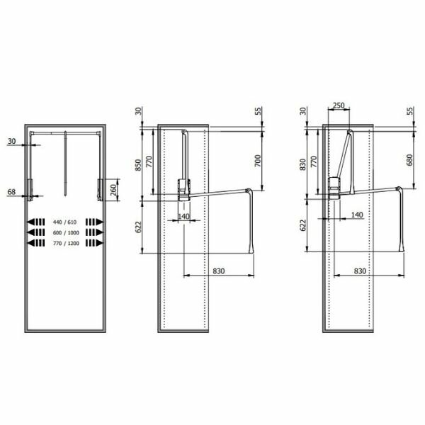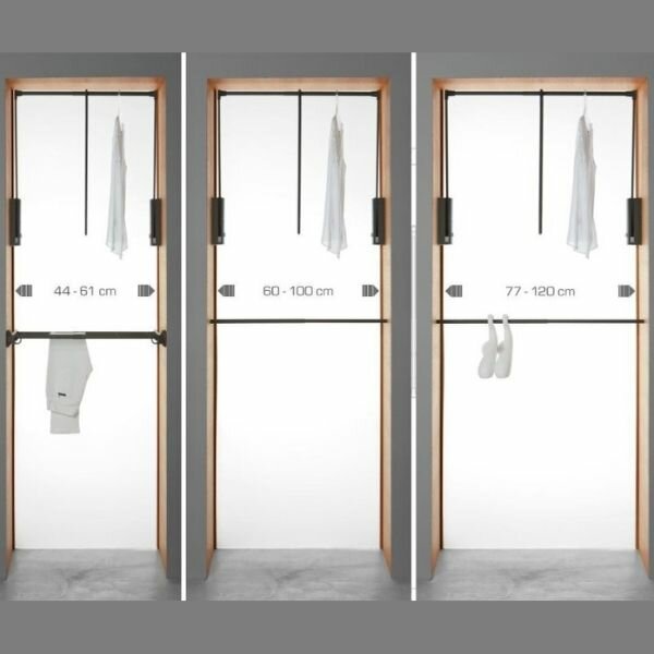 De kledinglift / Garderobelift Junior is geschikt voor tweezijdige bevestiging aan de binnenwanden van het corpus, geschikt voor kastbreedte van 770 - 1200 mm.