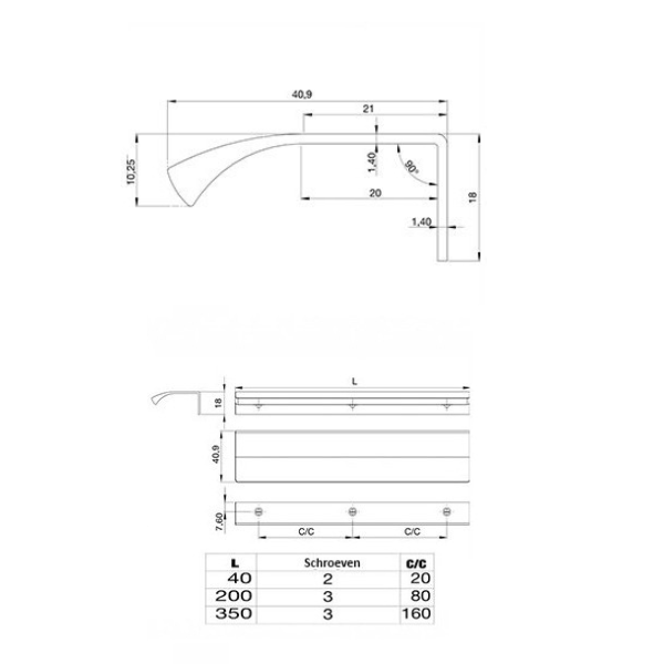- Boorafstand bij lengte 200 mm: 2x 80 mm