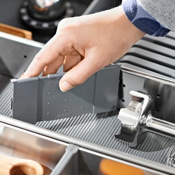 Het bestek opgeruimd en overzichtelijk in de ruime compartimenten van onze stijlvolle RVS bestekindeling. Ideaal voor het opbergen van al uw messen, vorken en lepels. Dankzij de grotere compartimenten en de tussenstukken houd u ook het groter werkbestek binnen handbereik.