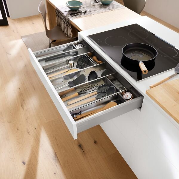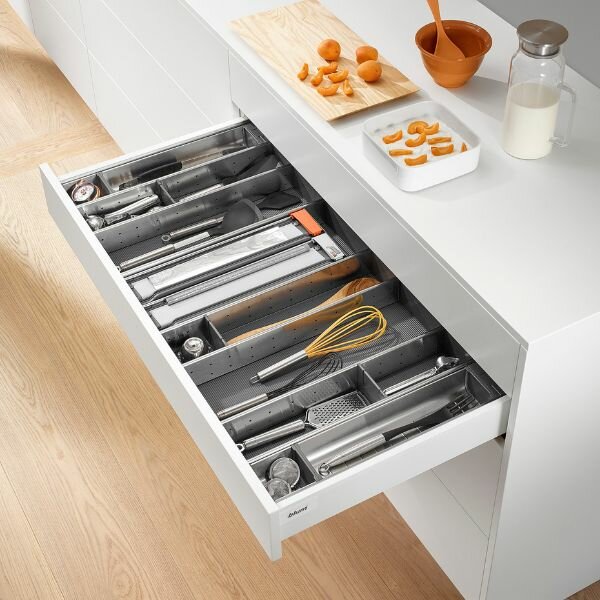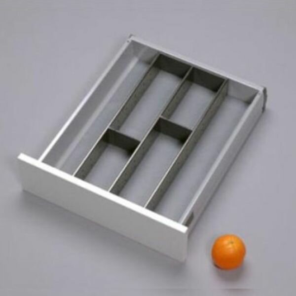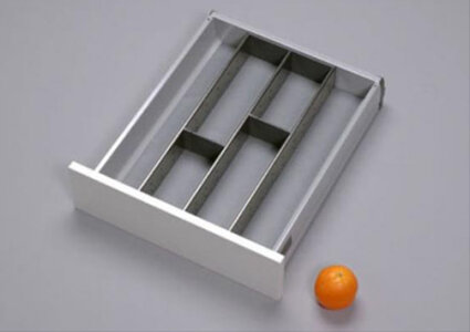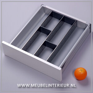 Het bestek opgeruimd en overzichtelijk in de ruime compartimenten van onze stijlvolle RVS bestekindeling. Ideaal voor het opbergen van al uw messen, vorken en lepels. Dankzij de grotere compartimenten en de tussenstukken houd u ook het groter werkbestek binnen handbereik.