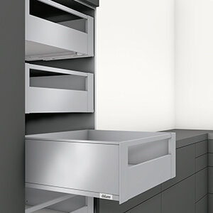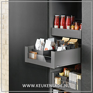 - 4 x Blum legrabox voorraadlade inclusief reling met volledig uittrekbare geleiders met maximale draagkracht 40 kg (minimale inbouwhoogte van 192 mm (C/Z))