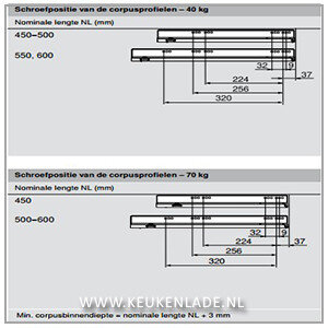 Daar de LEGRABOX lades voor verschillende doeleinden geschikt zijn, is er ook een verschil in het te kiezen draagvermogen. Lades voor handdoeken in de badkamer hebben vaak genoeg aan een draagvermogen van 40 kg, maar een lade van 120 cm breed vol met borden en schalen heeft al snel een draagvermogen nodig van 70 kg. Maak de keuze van het draagvermogen dus op basis van de breedte van de lade en het gebruik van de lade.
